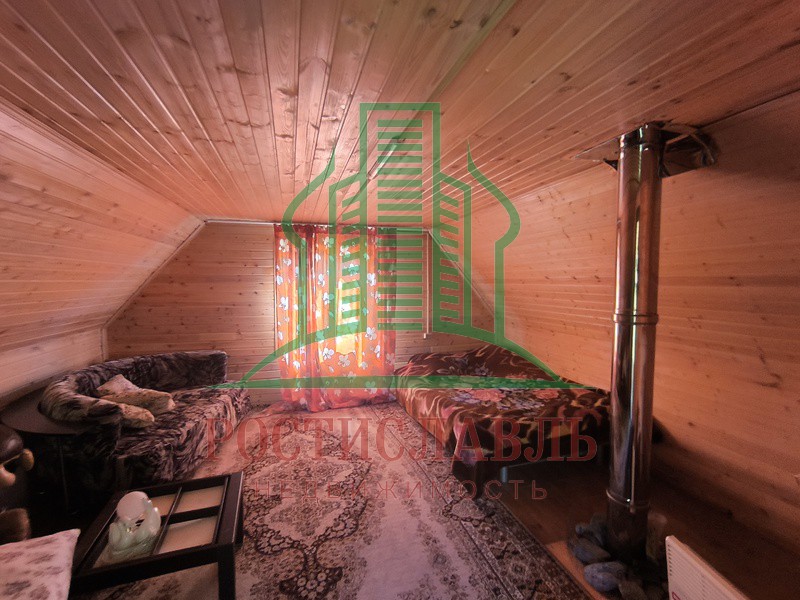 Баня (брус) с мансардой (каркасно-щитовая, утепленная) и верандой, две комнаты отдыха, парная, душ, туалет. Печка при входе, от трубы тепло на втором этаже. Общий размер 6 х 7.